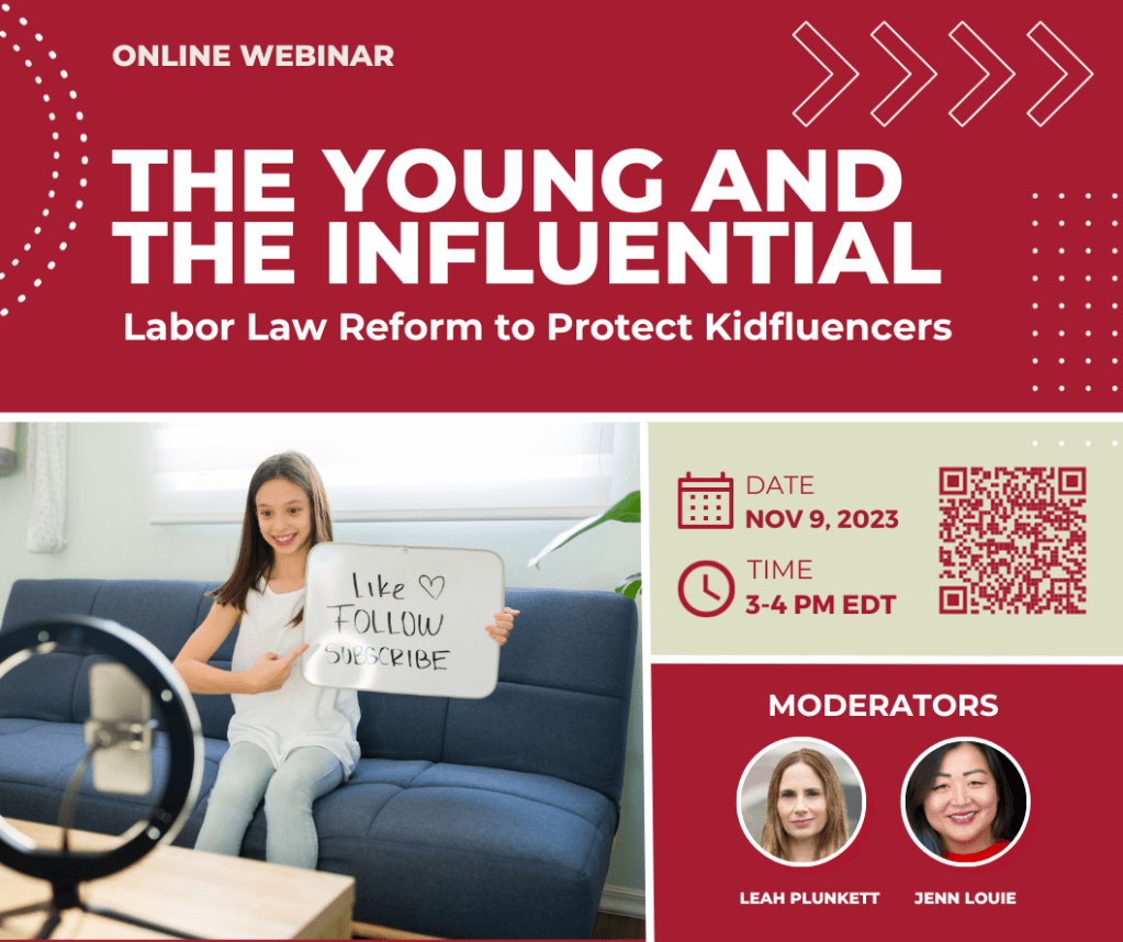Event Description: When social media becomes monetized, influencing becomes an industry. But often, the child stars of monetized social media accounts have no legal privacy protections or avenues to the revenue they help generate. Join moderators Leah Plunkett and Jenn Louie as well as panelists Chris McCarty (student founder and executive director of Quit Clicking Kids), Washington State Representative Kristine Reeves, Illinois Senator David Koehler, and Shreya Nallamothu to discuss the urgent need for protective legislation.